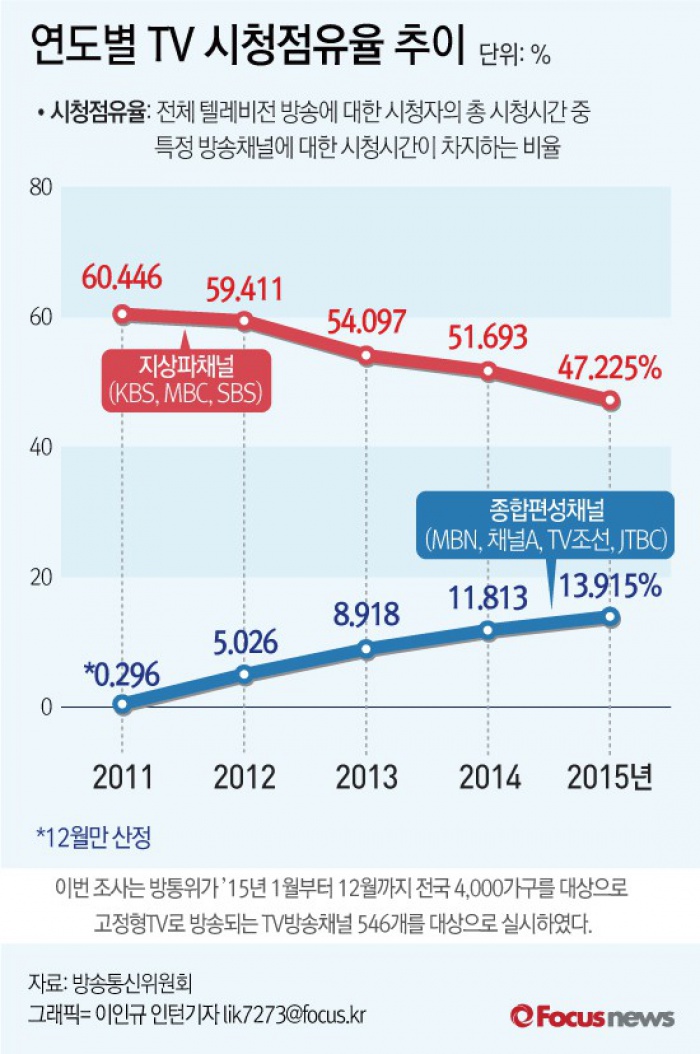 (서울=포커스뉴스) 방송통신위원회가 15일 텔레비전 방송채널 시청점유율 조사결과를발표했다.