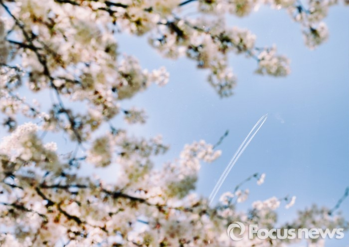 (서울=포커스뉴스) 15일 경기 용인시 명지대학교 자연캠퍼스 내 벚나무 위로 비행기가 궤적을 남기며 날아가고 있다. <사진제공=명지대학교>