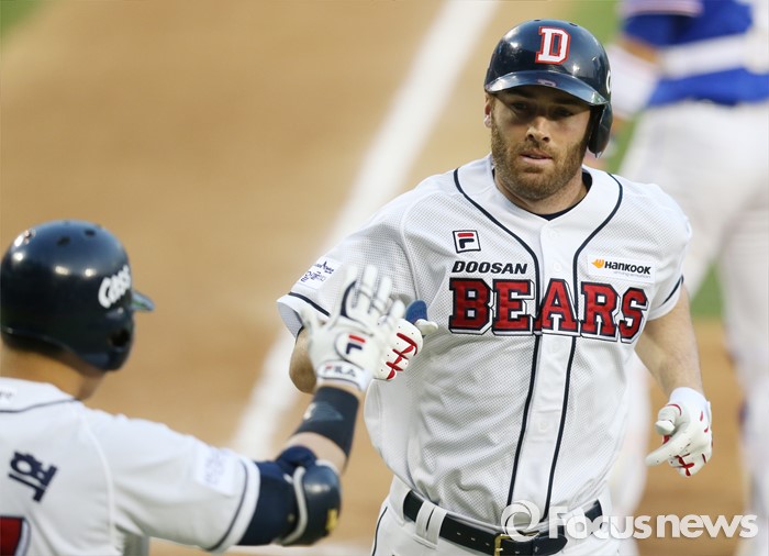(서울=포커스뉴스) 15일 서울 잠실구장에서 열린 2016 프로야구 삼성-두산 경기 1회말 1사 만루에서 두산 박건우의 좌익수 희생플라이로 3루주자 에반스가 홈인하고 있다.