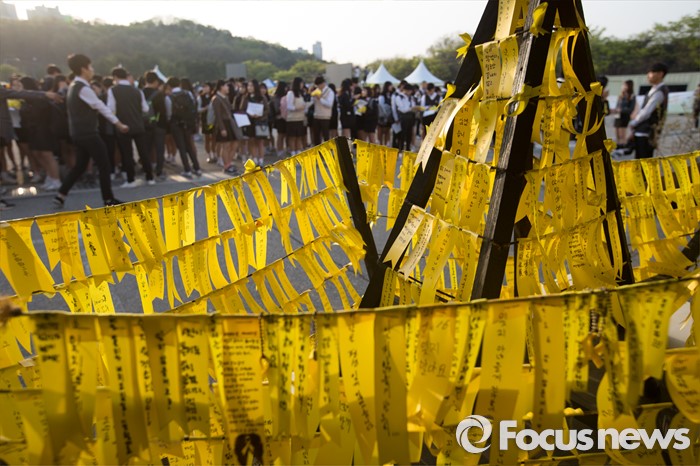 (안산=포커스뉴스) 세월호 참사 2주기를 하루 앞둔 15일 오후 경기도 안산시 단원구 세월호 정부합동분향소에서 안산시 고교학생회장단연합회 학생들이 추모제 행진을 위해 준비를 하고 있다.