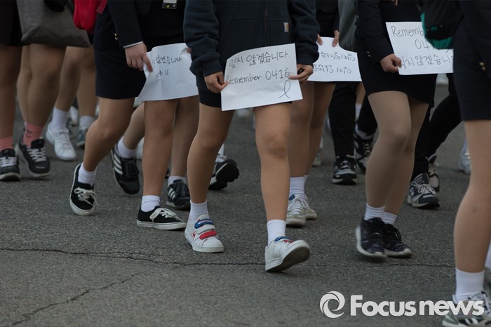 (안산=포커스뉴스) 세월호 참사 2주기를 하루 앞둔 15일 오후 경기도 안산시 단원구 세월호 정부합동분향소에서 안산시 고교학생회장단연합회 학생들이 안산문화광장 추모제 참석하기 위해 행진을 하고 있다.