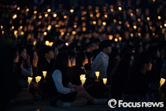 (안산=포커스뉴스) 세월호 참사 2주기를 하루 앞둔 15일 오후 경기도 안산시 단원구 안산문화광장에서 안산 지역 학생들이 추모제에 참석해 촛불을 들고 있다.