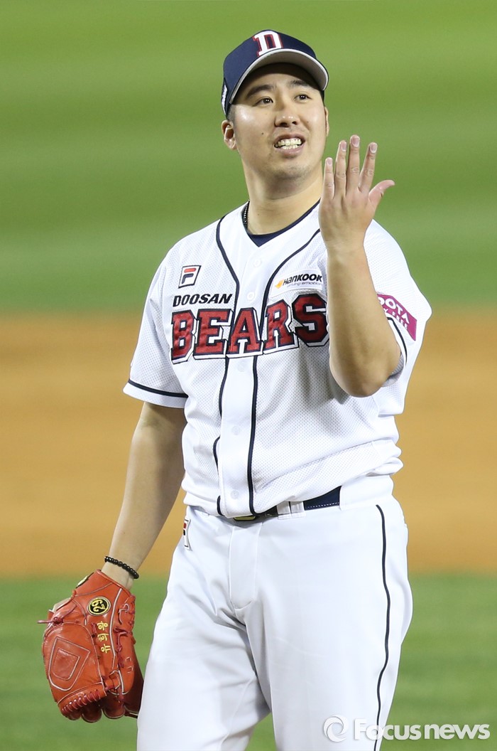 (서울=포커스뉴스) 15일 서울 잠실구장에서 열린 2016 프로야구 삼성-두산 경기에서 두산 투수 유희관이 4회 삼성 이영욱을 삼진으로 잡고 밝은 표정을 짓고 있다.