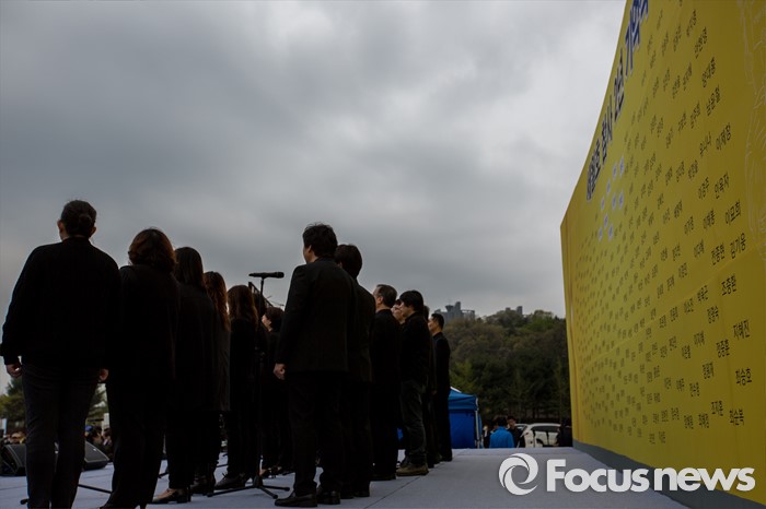 (안산=포커스뉴스) 16일 오전 경기도 안산시 단원구 화랑유원지에 마련된 합동분향소에서 열린 '세월호 참사 2년 기억식'에서 단원고 희생자 유가족으로 구성된 합창단이 추모노래를 부르고 있다.