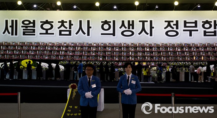 (안산=포커스뉴스) 세월호 참사 2주기인 16일 오전 경기도 안산시 단원구 화랑유원지에 마련된 합동분향소를 찾은 추모객들이 희생자들에게 헌화를 하고 있다.