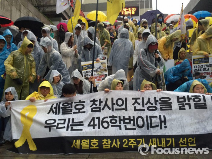(서울=포커스뉴스) 세월호 참사 2주기를 맞아 올해 대학에 입학한 전국 30개 대학 새내기 300여명이 세월호 참사의 진상을 밝히라고 외쳤다.
