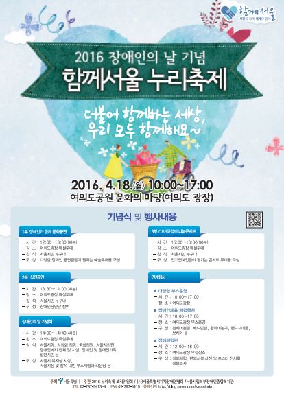 또 21일부터 23일까지는 서울시청에서 제14회 서울장애인인권영화제가, 21일에는 어린이대공원에서 장애인 창업을 위한 사랑의 나눔행사, 27일에는 서울무역전시컨벤션센터에서 서울시 장애인 취업박람회가 개최될 예정이다.