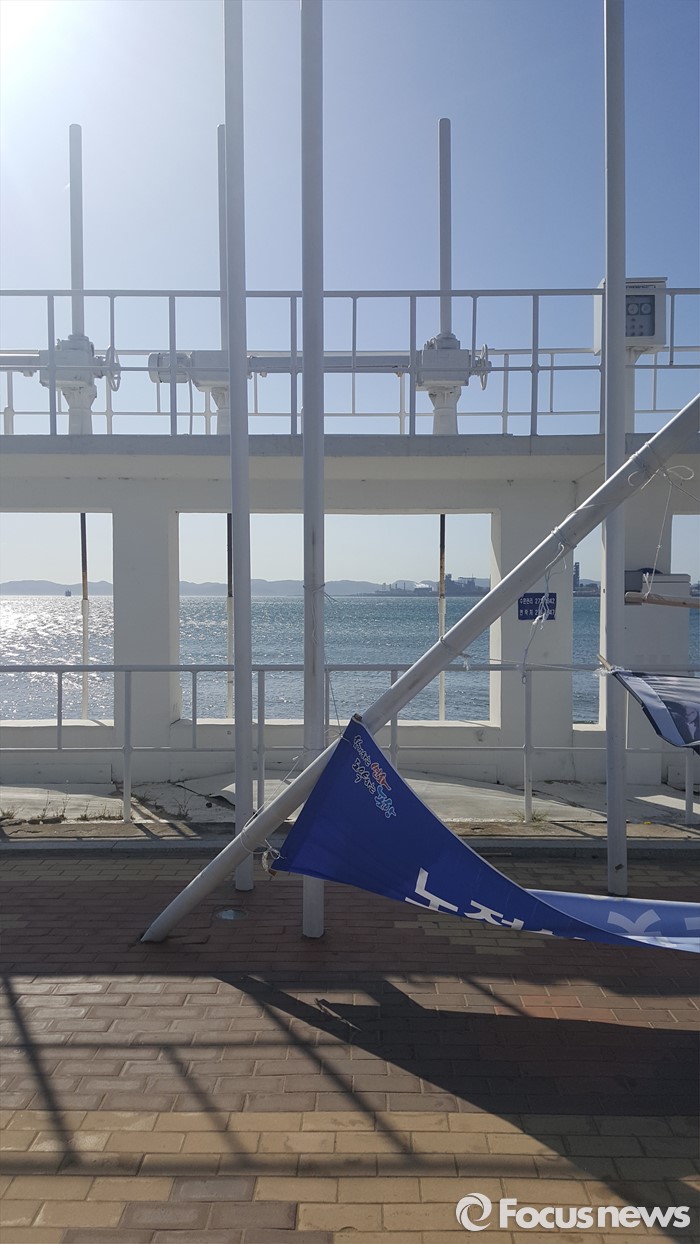 (포항=포커스뉴스) 경북 포항지역에 강풍이 불어닥친 17일 오전 경북 포항시 영일대해수욕장 인근에 플래카드가 설치된 철봉이 휘어져 있다. <사진제공=고경덕 독자>