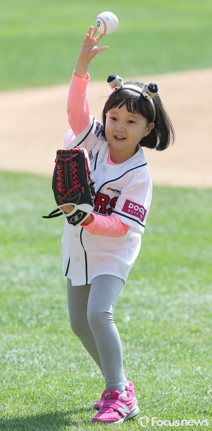 (서울=포커스뉴스) 17일 서울 잠실구장에서 열린 2016 프로야구 삼성-두산 경기에 앞서 TV 드라마 '응답하라 1988'에 진주로 출연했던 아역 탤런트 김설 어린이가 시구하고 있다.