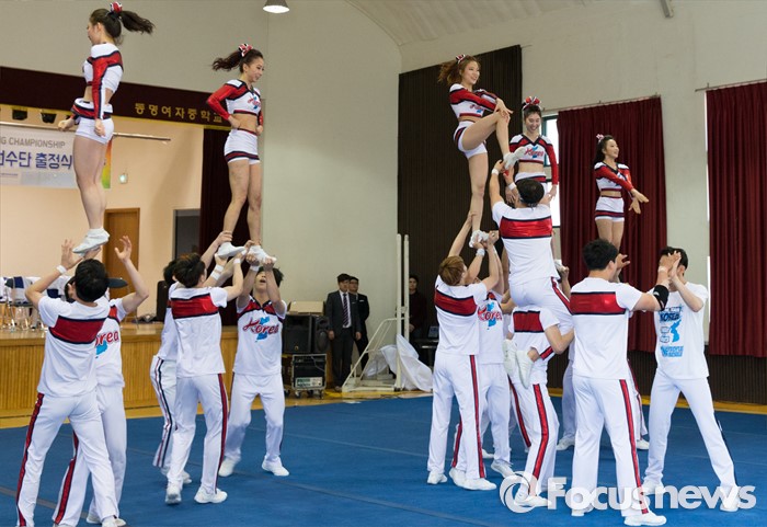 (서울=포커스뉴스) 17일 오후 서울 서대문구 동명여자중학교 체육관에서 열린 '2016 치어리딩 국가대표 선수단 출정식'에 참석한 선수들이 치어리딩 연기를 선보이고 있다.