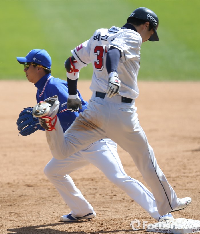 (서울=포커스뉴스) 17일 서울 잠실구장에서 열린 2016 프로야구 삼성-두산 경기 4회말 무사 1,2루에서 두산 박건우가 투수앞 희생번트를 대고 1루에서 아웃되고 있다.
