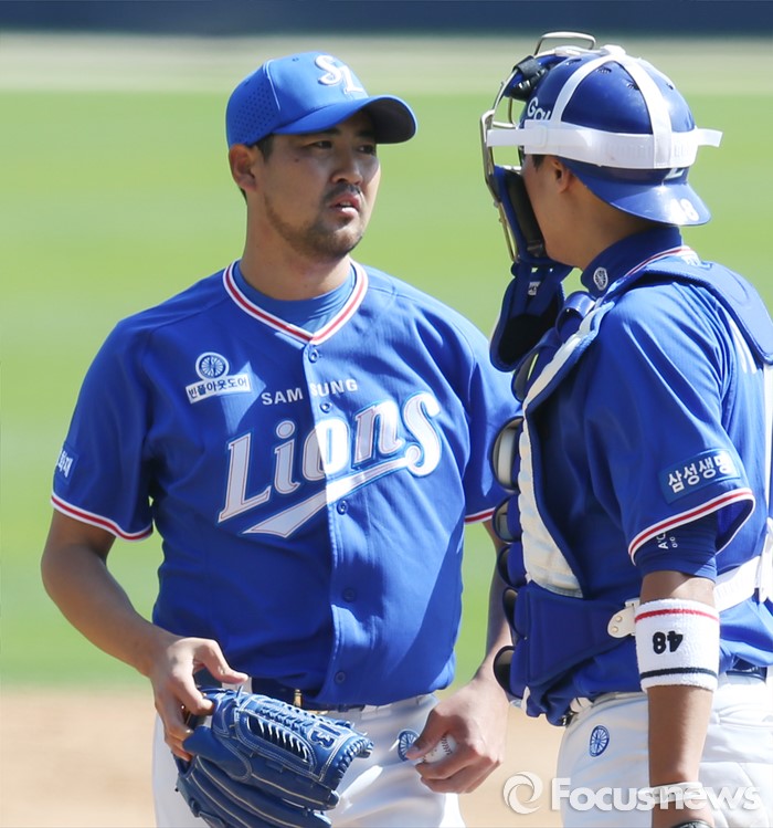 (서울=포커스뉴스) 17일 서울 잠실구장에서 열린 2016 프로야구 삼성-두산 경기 4회말 삼성 포수 이흥련이 마운드에 올라가 실점하고 흔들리는 투수 장원삼을 격려하고 있다.