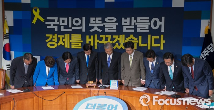 (서울=포커스뉴스) 김종인 더불어민주당 비대위 대표와 비대위원들이 18일 오전 서울 여의도 국회에서 비상대책위원회의에 앞서 국민들을 향한 감사의 인사를 하고 있다. 왼쪽부터 이개호, 김현미, 김영춘, 진영 비대위원, 김 대표, 이종걸 원내대표, 양승조, 정성호, 이춘석 비대위원.