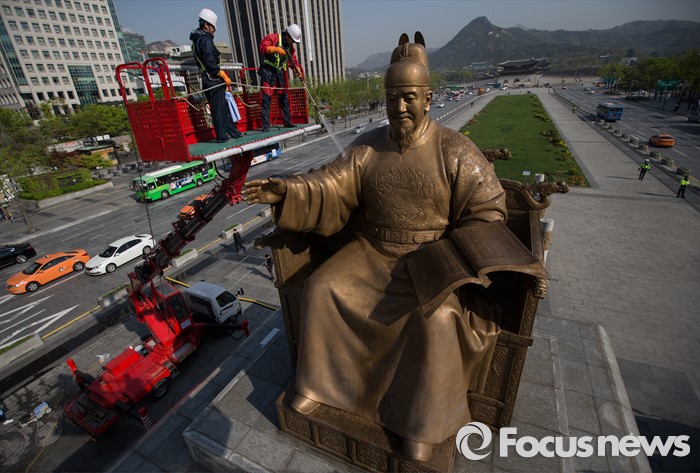 (서울=포커스뉴스) 18일 오전 서울 세종로사거리 광화문광장에서 서울시 관계자들이 세종대왕 동상 세척작업을 하고 있다.