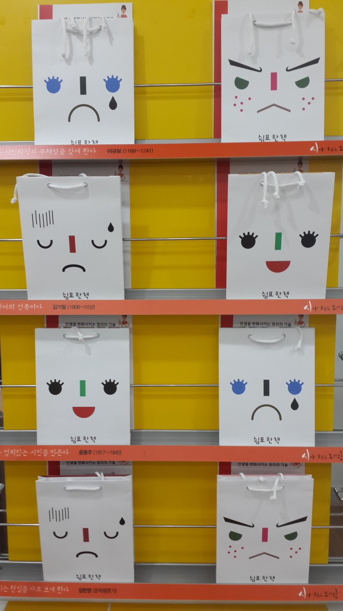 '쉼표 한 책'은 기쁨, 슬픔, 화남, 지침의 표정으로 된 290개의 종이가방 중 그날의 기분에 맞는 것을 고르면 서울도서관 사서가 선별한 독서, 성공, 힐링, 위로, 여행 등 표정별 추천도서를 대여할 수 있는 이벤트다.