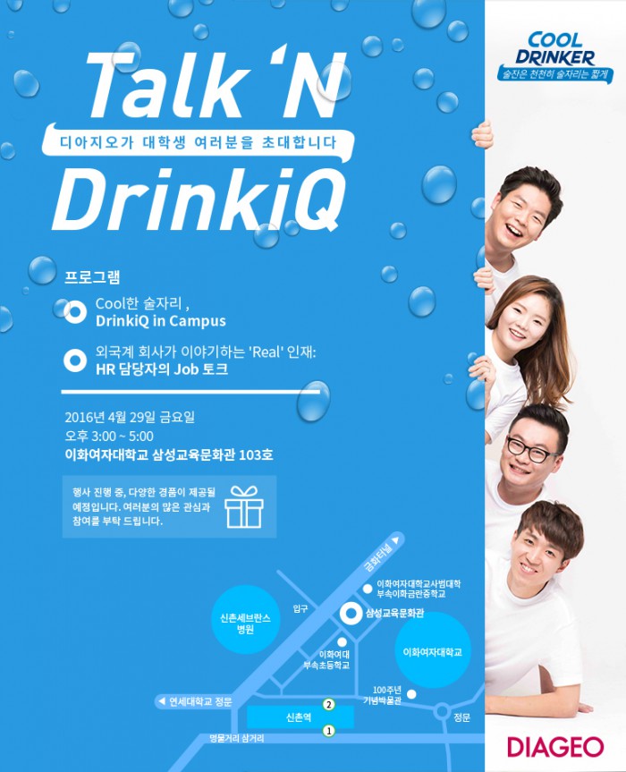 주류기업 디아지오코리아는 오는 29일 오후 3시부터 5시까지 이화여자대학교 삼성교육문화관 103호에서 대학생들을 대상으로 건전음주 강연 '토크 앤 드링크아이큐(Talk‘N DrinkiQ)'를 개최한다고 18일 밝혔다.