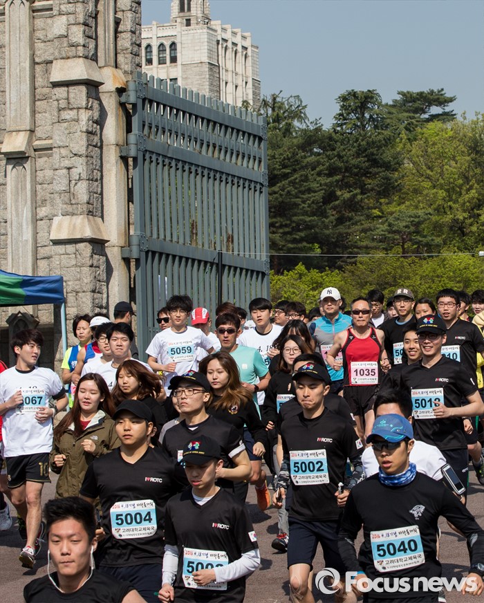 (서울=포커스뉴스) 4·19 혁명 56주기를 하루 앞둔 18일 오전 서울 성북구 고려대학교에서 열린 '4·18 희망나눔 마라톤'에 참가한 고려대생 및 일반인 참가자들이 힘차게 출발하고 있다.
