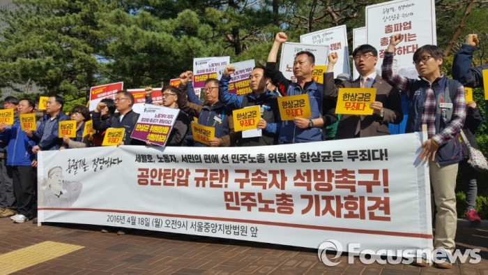 이어 민주노총은 기자회견문을 통해 "박근혜 정권의 노동개악에 대한 민심은 20대 총선 결과를 통해 드러났다"며 "한상균 위원장을 비롯한 모든 구속자를 즉각 전원 석방하라"고 요구했다.
