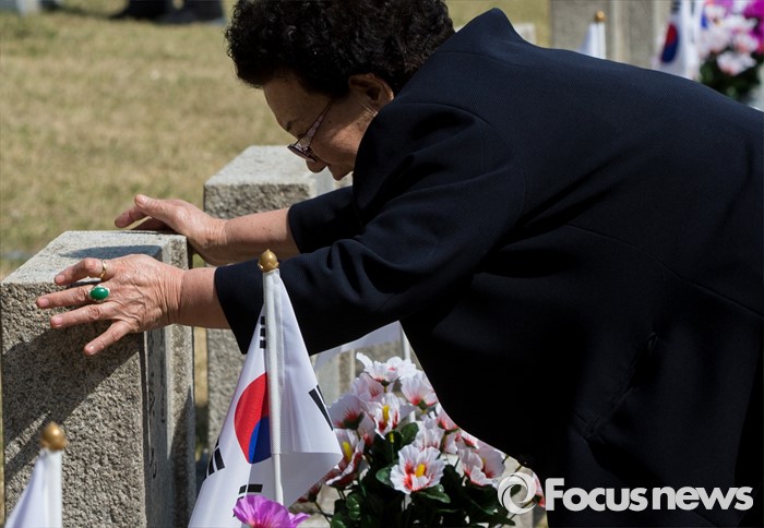 (서울=포커스뉴스) 4·19 혁명 56주기를 하루 앞둔 18일 오전 서울 강북구 국립4.19 민주묘지를 찾은 한 유가족이 남편의 묘비를 어루만지고 있다.