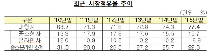 반면 중소형 손보사들의 점유율은 2010년말 19.3%에서 점차 감소해 2015년말 15.7%에 지나지 않았다.