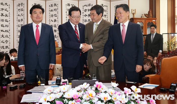 (서울=포커스뉴스) 18일 오전 서울 여의도 국회 의장실에서 열린 3당 원내대표 회동에서 정의화(왼쪽 두번째) 국회의장과 이종걸 더불어민주당 원내대표가 악수하고 있다. 왼쪽부터 새누리당 원유철 원내대표, 정 의장, 더불어민주당 이종걸 원내대표, 국민의당 주승용 원내대표.