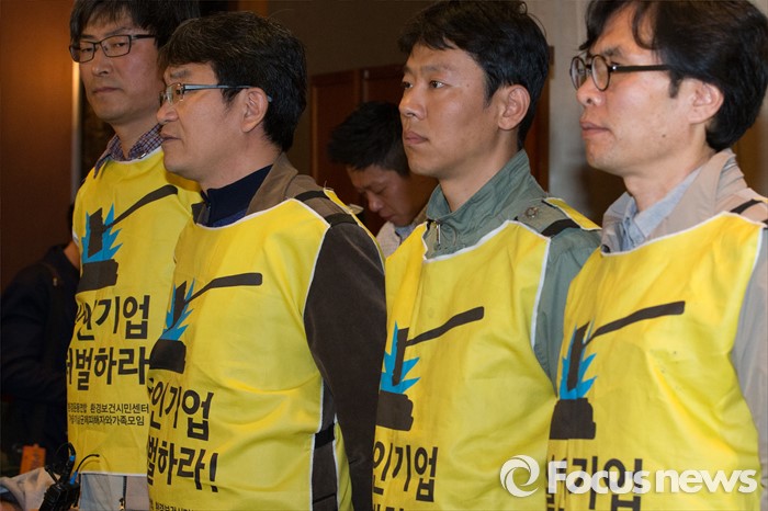 (서울=포커스뉴스) 18일 오전 서울 중구 롯데호텔앤리조크 서울에서 열린 가습기 살균제 사망사건 관련 기자회견이 끝나고 피해자 유족들을 비롯한 시민단체 회원들이 입장을 발표하고 있다.