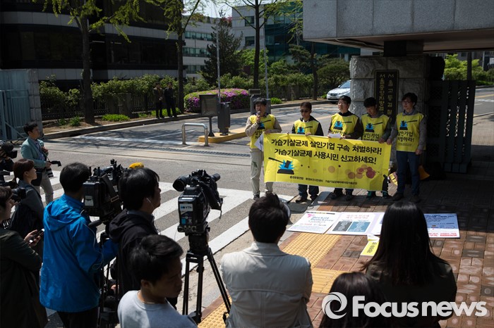 (서울=포커스뉴스) 18일 오전 서울 서초구 서울중앙지방검찰청 앞에서 가습기살균제피해자와가족모임 등 단체들이 엄정한 가습기 살균제 피해 조사를 촉구하는 기자회견을 하고 있다.