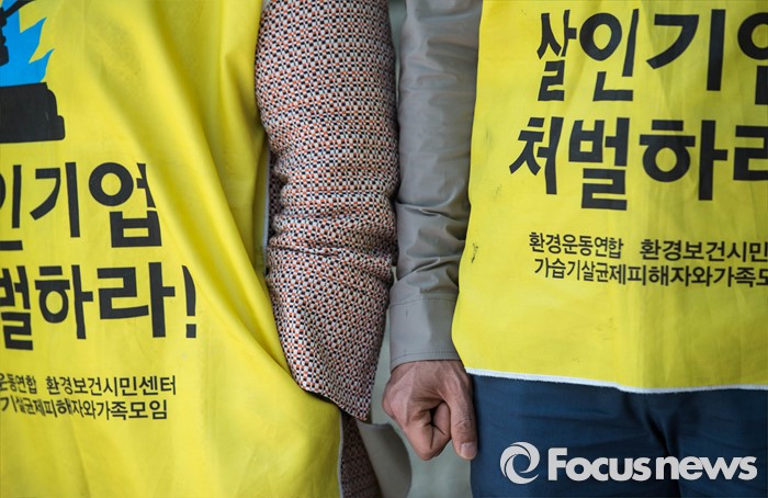 (서울=포커스뉴스) 18일 오전 서울 서초구 서울중앙지방검찰청 앞에서 가습기살균제피해자와가족모임 등 단체들이 엄정한 가습기 살균제 피해 조사를 촉구하는 기자회견을 하고 있다.