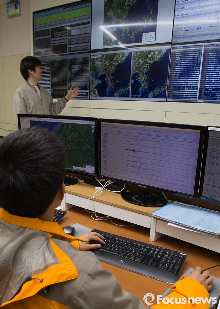 (대전=포커스뉴스) 오스카 에레라 주한 에콰도르 대사가 18일 오전 대구 유성구 한국지질자원연구원 내 지진연구센터 상황실을 방문한 가운데 관계자들이 국내 지진상황을 모니터하고 있다.