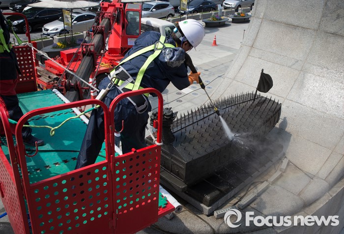 (서울=포커스뉴스) 18일 오전 서울 세종로사거리 광화문광장에서 서울시 관계자들이 이순신장군 동상 세척 및 보존 작업을 하고 있다.