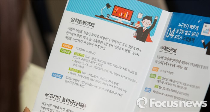 (대전=포커스뉴스) 이기권 고용노동부장관이 대전 유성구 충남대학교를 방문, 대학생들과 함께 찾아가는 정책설명회 및 토크콘서트에 참석한 학생이 고용정책 관련 홍보책자를 살피고 있다.