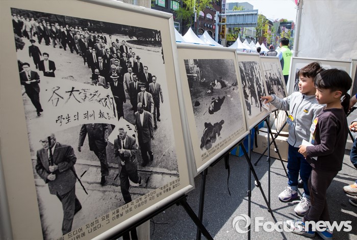 (서울=포커스뉴스) 4·19 혁명 56주기를 하루 앞둔 18일 오후 서울 강북구 광산사거리 인근에서 열린 '4.19 혁명 국민문화제 2016'에 참석한 어린이들이 혁명 당시 사진 자료들을 보고 있다.