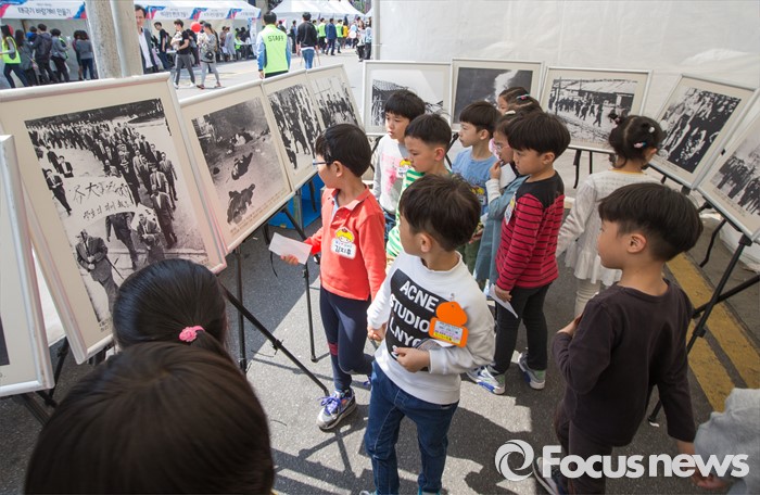 (서울=포커스뉴스) 4·19 혁명 56주기를 하루 앞둔 18일 오후 서울 강북구 광산사거리 인근에서 열린 '4.19 혁명 국민문화제 2016'에 참석한 어린이들이 혁명 당시 사진 자료들을 보고 있다.