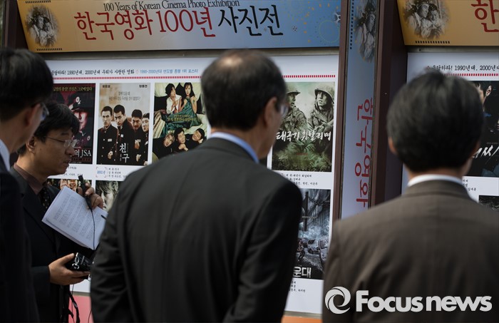 (서울=포커스뉴스) 18일 오후 서울시청 앞 광장에서 열린 '한국영화 100년 사진전' 개막식에서 시민들이 전시된 사진을 살펴보고 있다.
