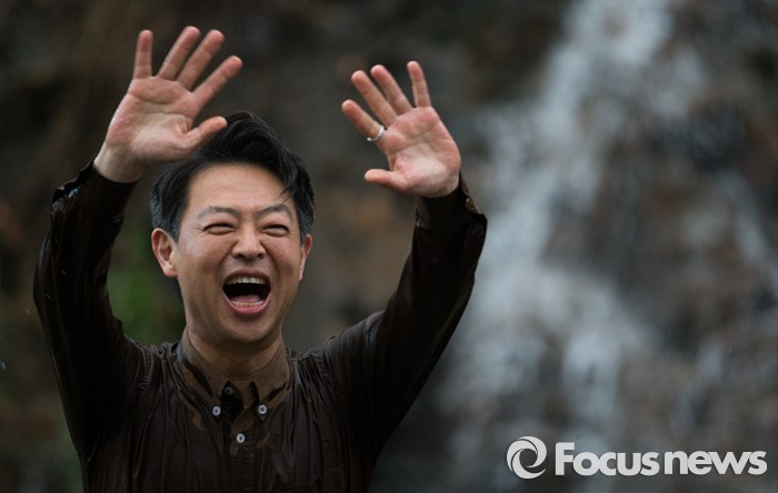 (서울=포커스뉴스) 제20대 국회의원 선거에서 당선된 김영호 더불어민주당 서대문을 당선자가 18일 오후 서울 서대문구 홍제천 폭포마당에 입수 하고 있다. 김 당선자는 서대문을 지역 투표율 60% 달성 시 홍제천 입수, 아내는 픽미댄스를 추겠다고 약속 하였다.