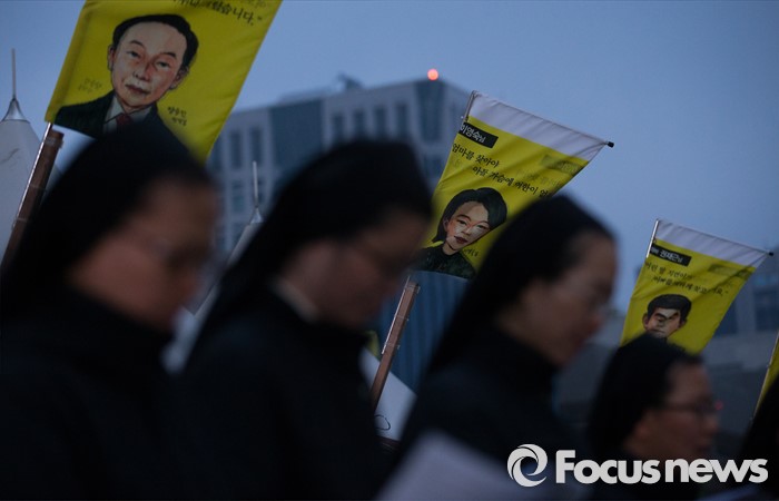 (서울=포커스튜스) 세월호 참사 2주기가 이틀 지난 18일 오후 서울 종로구 광화문광장에서 신부들이 '세월호 희생자 기억미사'에 참석해 기도하고 있다.