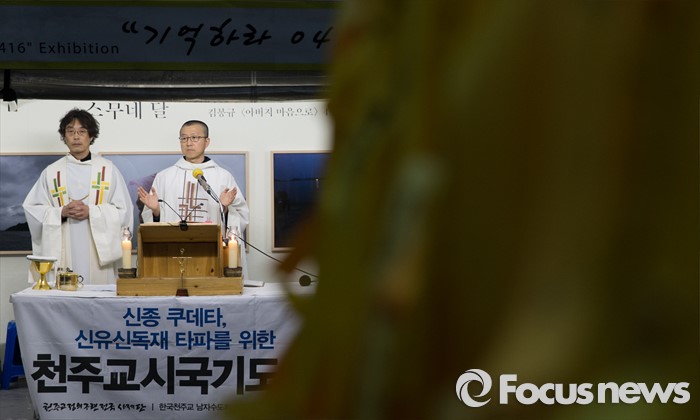 (서울=포커스튜스) 세월호 참사 2주기가 이틀 지난 18일 오후 서울 종로구 광화문광장에서 신부들이'세월호 희생자 기억미사'를 진행하고 있다.