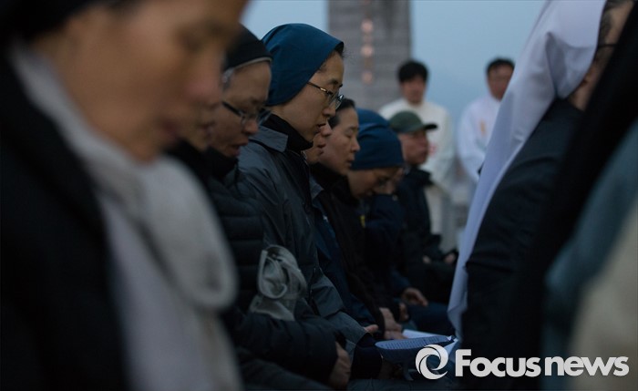 (서울=포커스튜스) 세월호 참사 2주기가 이틀 지난 18일 오후 서울 종로구 광화문광장에서 신부들이 '세월호 희생자 기억미사'에 참석해 기도하고 있다.