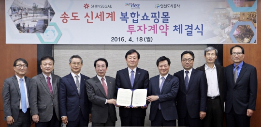 인천경제자유구역청(이하 인천경제청)과 신세계는 18일 인천경제청에서 '송도 신세계 도심형 복합쇼핑몰 건립을 위한 토지매매계약' 체결식을 가졌다.