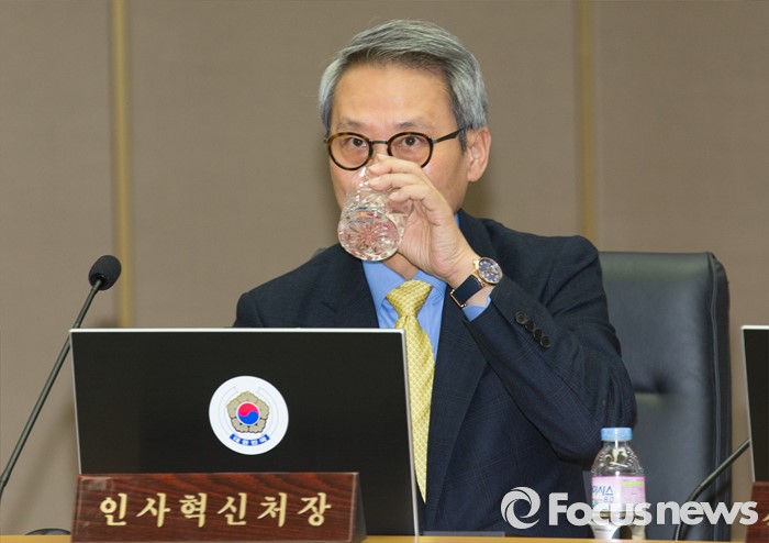 (세종=포커스뉴스) 이근면 인사혁신처장이 19일 오전 세종시 정부세종청사 국무회의장에서 서울-세종 영상회의로 열린 국무회의에 참석해 물을 마시고 있다.