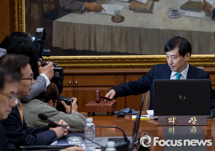 (서울=포커스뉴스) 이주열 한국은행 총재가 19일 오전 서울 중구 남대문로 한국은행 본관에서 열린 금융통화위원회의에 참석해 개회를 알리는 의사봉을 두드리고 있다.