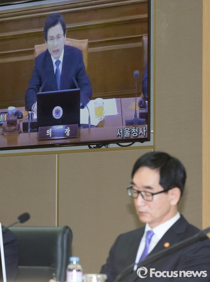 (세종=포커스뉴스) 이준식 사회부총리 겸 교육부장관이 19일 오전 세종시 정부세종청사 국무회의장에서 서울-세종 영상회의로 열린 국무회의에 참석해 황교안 국무총리의 모두발언을 경청하고 있다.