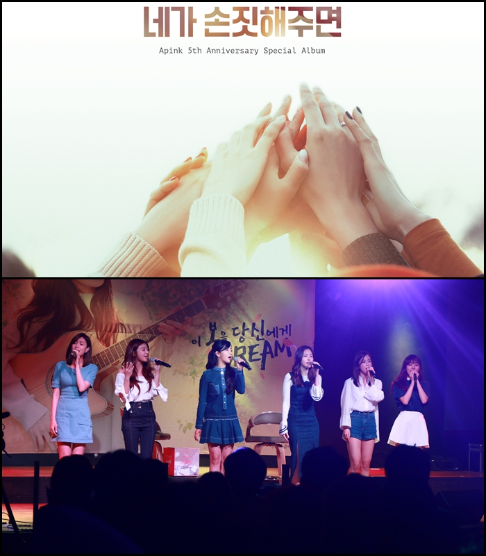 함께 공개된 '네가 손짓해주면' 뮤직비디오는 에이핑크 멤버들과 많은 팬들이 함께 해왔던 콘서트 현장의 모습을 담아 가슴 찡한 감동을 선사한다.걸그룹 에이핑크가 19일 자정 각종 음원사이트를 통해 에이핑크의 5번째 생일 맞아 팬들에게 고마움을 담은 노래 ‘네가 손짓해주면’을 발표했다. <사진제공=플랜에이엔터테인먼트>