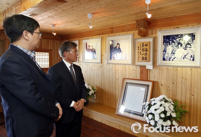| △ DJ생가 방문해 DJ업적을 살피는 문재인 |