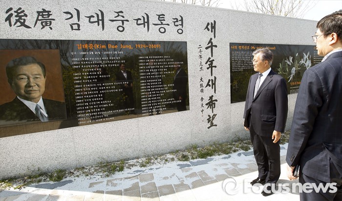 (서울=포커스뉴스) 문재인 전 더불어민주당대표가 18일 김대중 전 대통령의 3남인 김홍걸 더불어민주당 국민통합위원장과 함께 전남 신안 하의도에 있는 김 전 대통령의 생가를 방문, 김대중대통령 기념비를 보고 있다.<사진제공=문재인의원실>