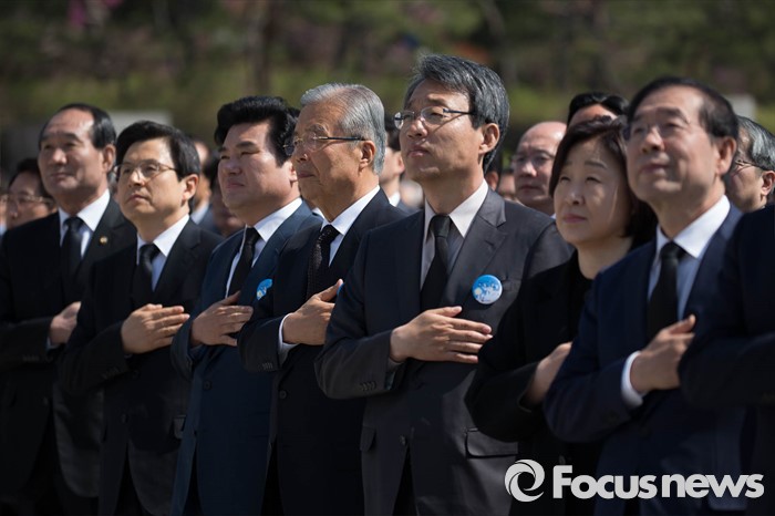 (서울=포커스뉴스) 19일 오전 서울 강북구 국립 4.19 민주묘지에서 열린 '제56주년 4.19혁명 기념식'에서 황교안(왼쪽 두 번째부터) 국무총리, 원유철 새누리당 원내대표, 김종인 더불어민주당 비대위 대표, 김성식 국민의당 20대 국회의원 당선자, 심상정 정의당 대표, 박원순 서울시장이 국민의례를 하고 있다.