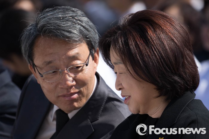 (서울=포커스뉴스) 19일 오전 서울 강북구 국립 4.19 민주묘지에서 열린 '제56주년 4.19혁명 기념식'에 참석한 김성식(왼쪽) 국민의당 20대 국회의원 당선인과 심상정 정의당 대표가 대화하고 있다.