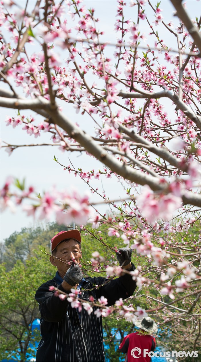 (세종=포커스뉴스) 화창한 봄 날씨를 보인 19일 오전 세종시 연서면 복숭아밭에서 농민이 복사꽃을 속아내고 있다.