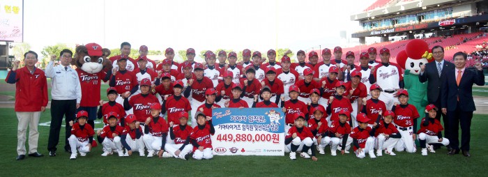 KIA는 러브투게더 지원을 받고 있는 야구 유망주를 초청해 장학금 전달식을 갖는 등 '타이거즈 러브투게더 데이'를 지속적으로 실시한다. 유소년 야구단 지원, 문화나눔 활동, 몽골 야구동아리 어린이 지원 등 국내외에서 다양한 나눔 활동을 펼쳐나간다.프로야구 KIA가 기아자동차와 함께하는 사회공헌프로그램 '타이거즈 러브투게더'을 진행한다. 사진은 지난해 열린 '타이거즈 러브투게더 데이' 행사 모습. <사진제공=KIA타이거즈>