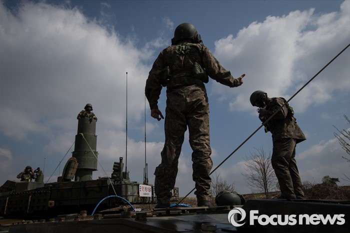(여주=포커스뉴스) 19일 오전 경기도 여주시 남한강 일대에서 육군 20사단이 K-2 흑표전차 잠수도하훈련을 하고 있다. K-2흑표전차는 최고 4.1m수심의 하천을 문교나 부교없이 독자적으로 건널 수 있다.
